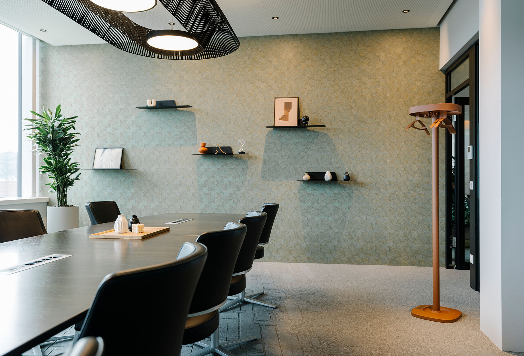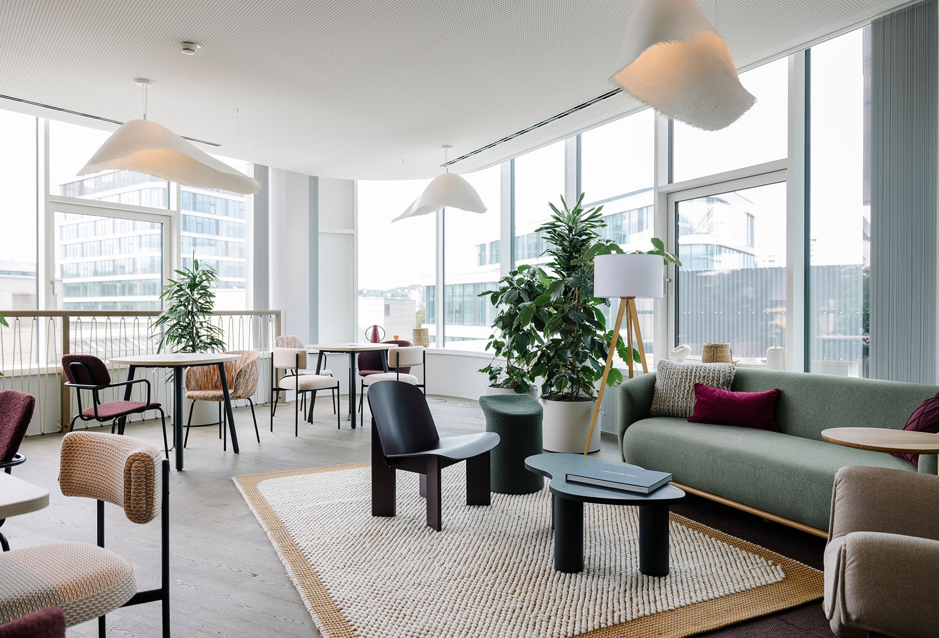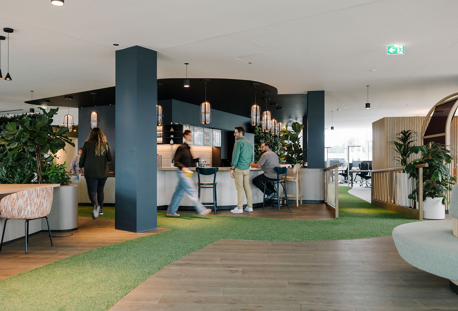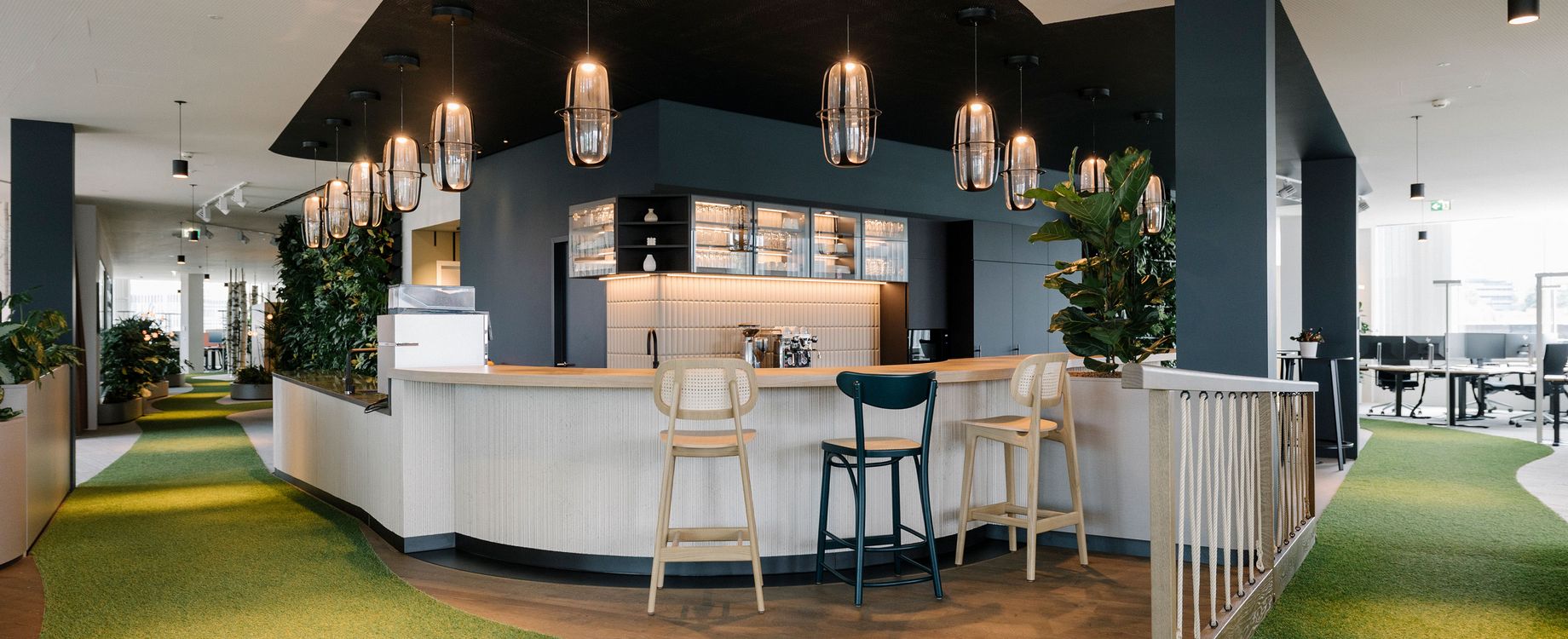 Eine offene Café-Zone bildet das lebendige Zentrum des Büros – ein Herzstück, das das Ankommen erleichtert und Begegnung fördert – in mehrfacher Hinsicht: Im kulturellen Sinne fühlen sich die Mitarbeiter:innen durch den neu gestalteten (Büro)Raum wieder stärker mit dem Unternehmen und miteinander verbunden. Virtuell sind sie wiederum mit ihren Kolleg:innen an anderen Standorten und Kontinenten bestens durch high-end technische und räumliche Lösungen verbunden.