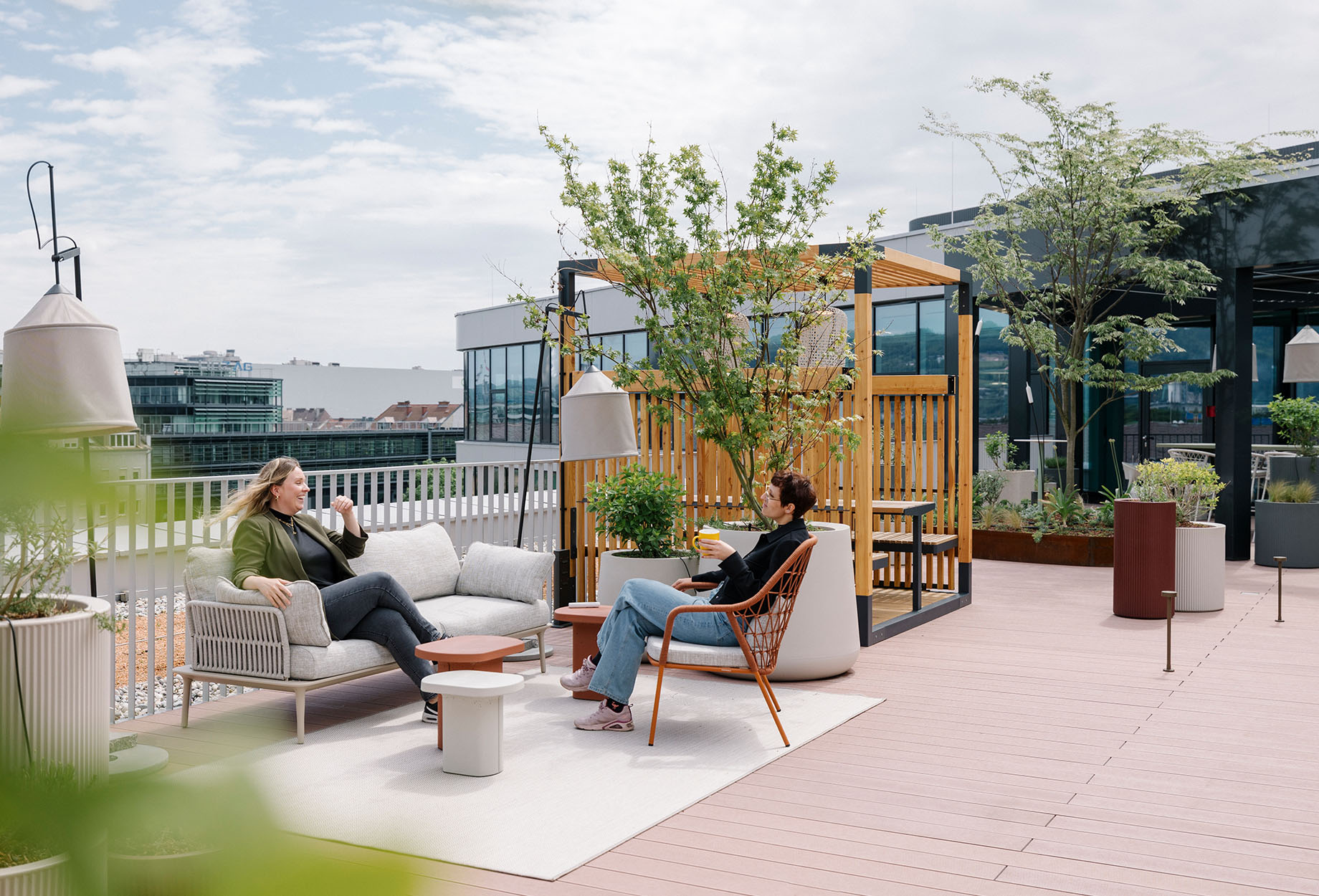 Natürliche Materialien, warme Töne und eine Möblierung, die an ein urbanes Kaffeehaus erinnert, verankern die Guatemala-Story im Raum. Rundherum liegen flexible Teamflächen, kleine Rückzugsräume für Videocalls und ruhige Arbeitsplätze für Fokusphasen. Sichtachsen, gut gesetzte Screens und plug-and-play-Technik machen die globale Verteilung der Teams im Alltag selbstverständlich. Die große Terrasse erweitert diese Logik nach draußen: überdacht, begrünt, mit vollwertigen Arbeitsplätzen unter freiem Himmel.