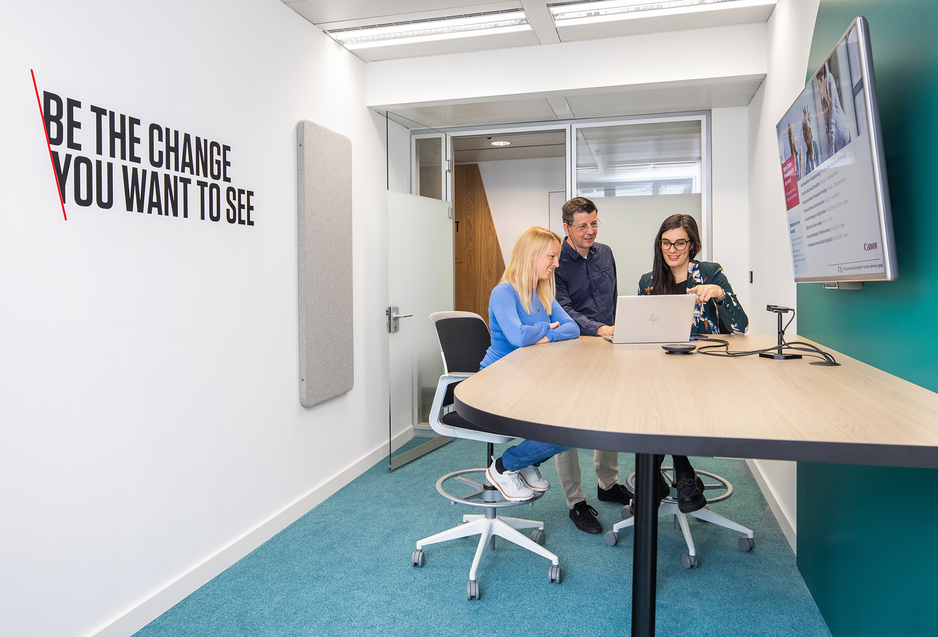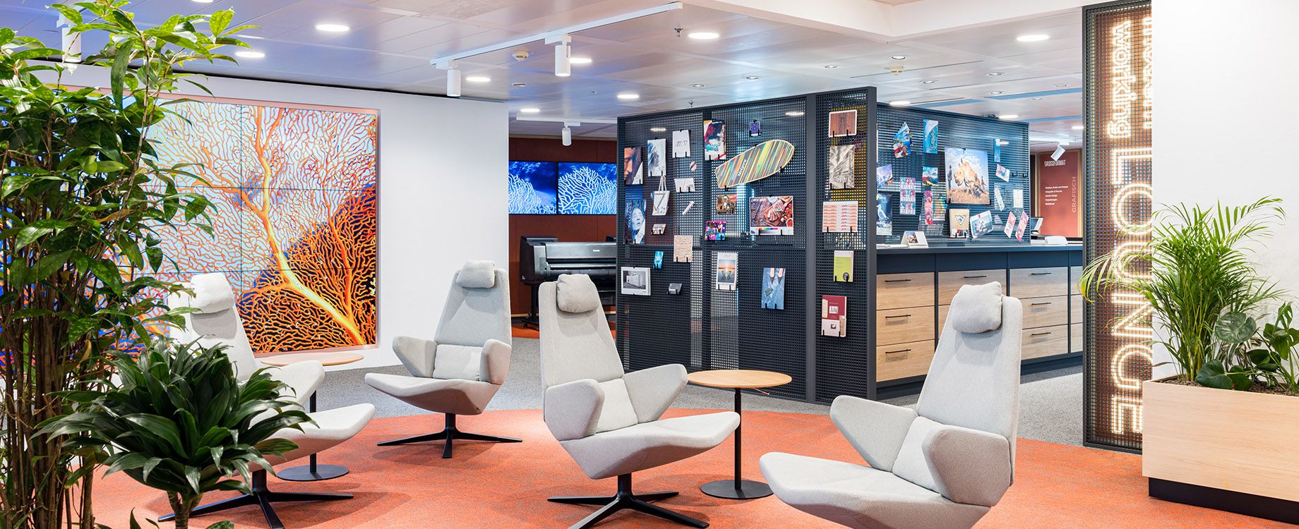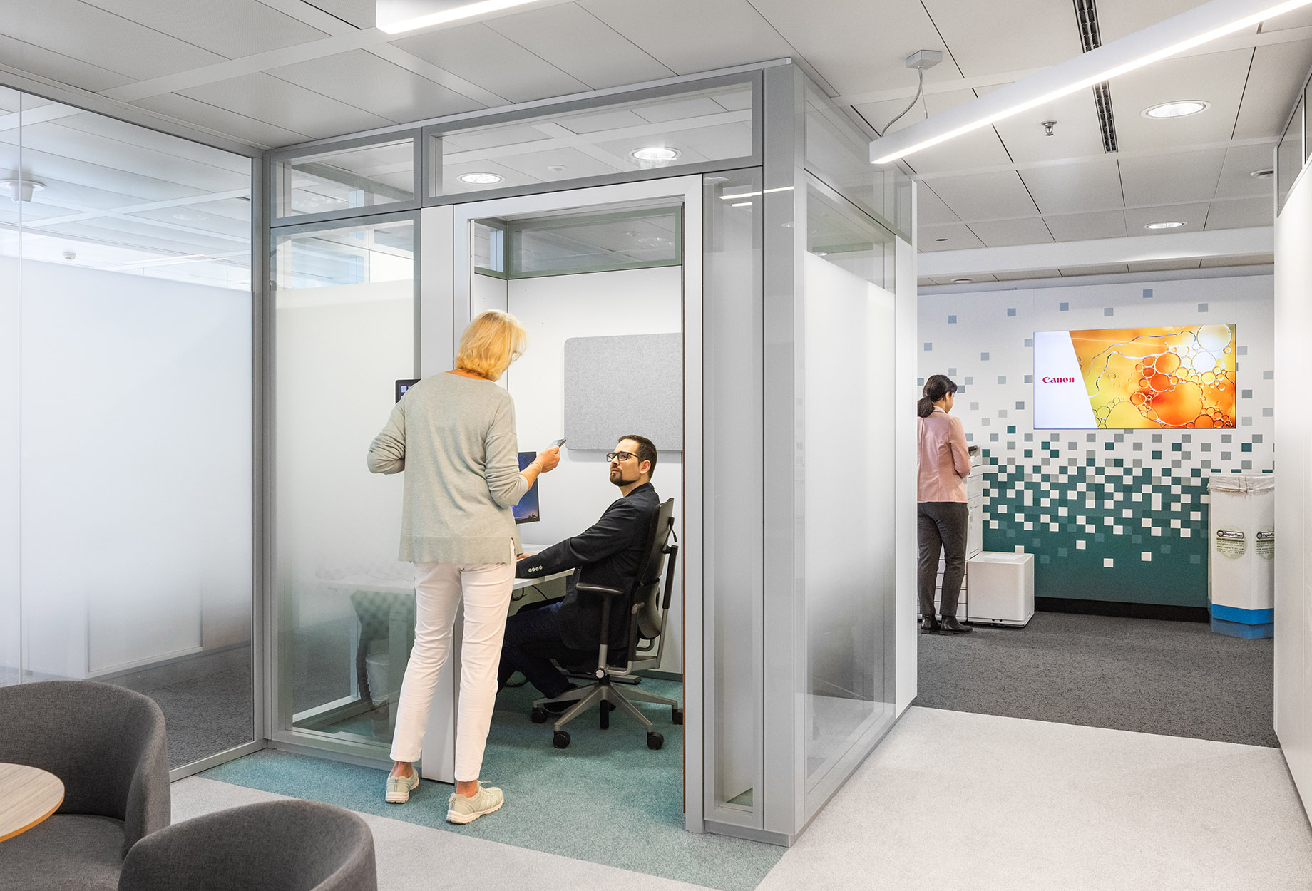 Mitte 2024 bezogen Canon Austria und Canon CEE einen gemeinsamen Standort für über 300 Mitarbeiter:innen. Grundlage für die Gestaltung war die konzernweite New Ways of Working-Policy, die Activity-Based Working und Desk Sharing auf alle Organisationseinheiten ausrollt. Das Herzstück ist die Customer Experience Zone mit Präsentationsflächen, Begegnungsräumen und einem hybriden TV-Studio.