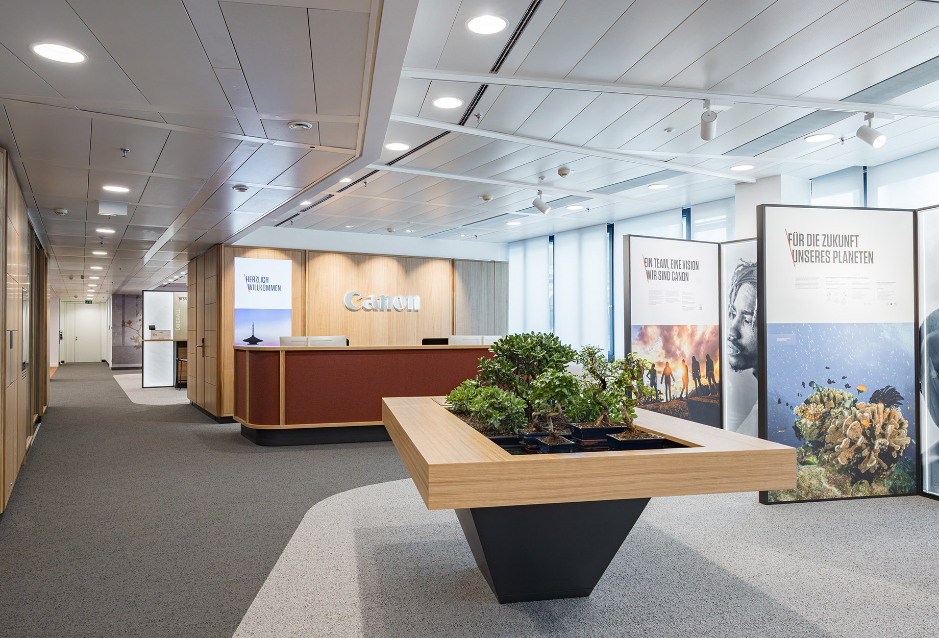 Von den ersten Impulsen 2021 bis zur Fertigstellung 2025 entstand ein Büro, das Funktionalität mit Inspiration verbindet, Zusammenarbeit fördert und Canons Innovationskraft sichtbar macht. Die neue Firmenzentrale steht für moderne Arbeitswelten sowie nachhaltige Unternehmensführung.