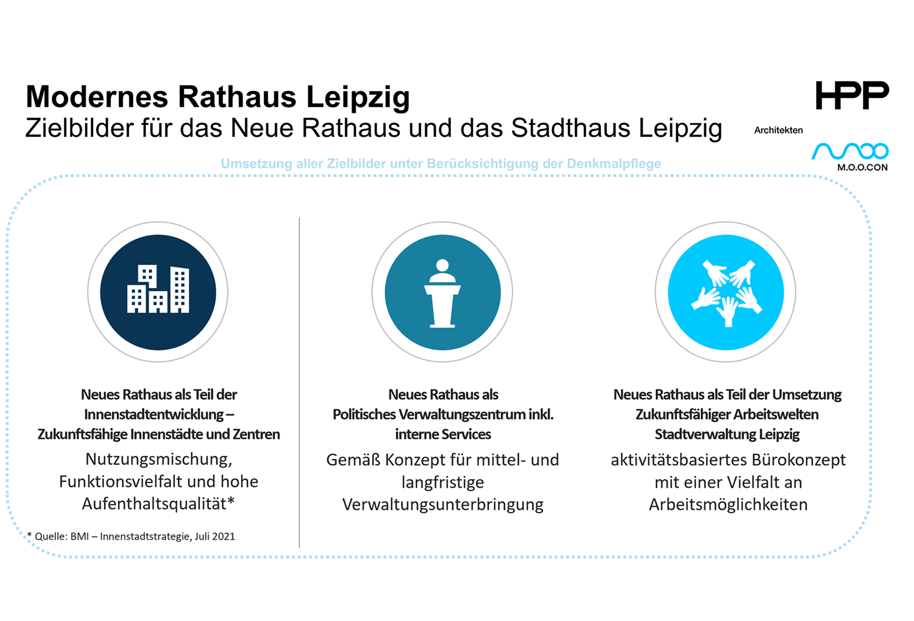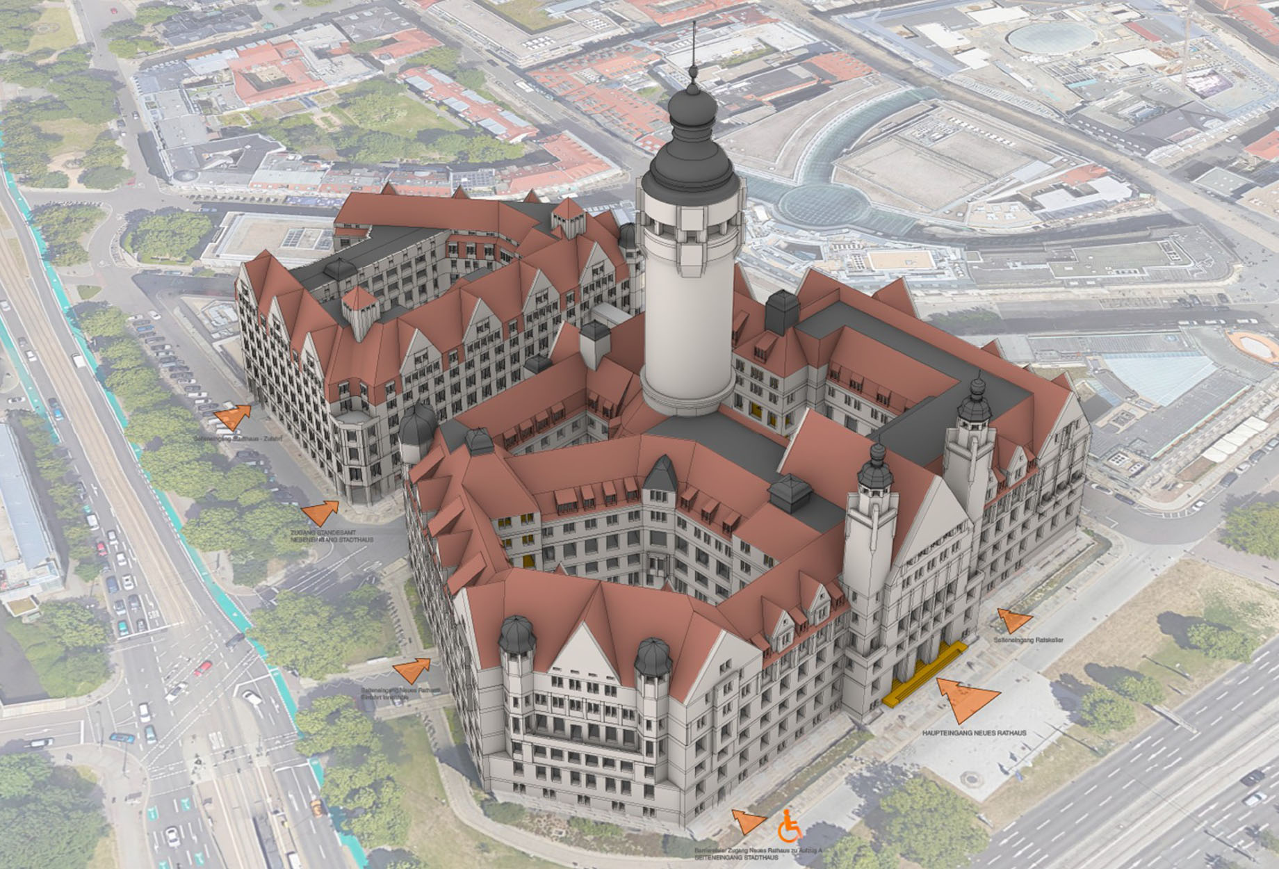 Neues Rathaus Leipzig, Zielbilder © M.O.O.CONAm Anfang stand die Bestandsanalyse, mit der die Stadtverwaltung eine einheitliche Datenbasis erhält. Ein digitales 3D-Modell erleichtert die Darstellung von Sanierung, Belegung, Organisation und Nutzung sowie die Kommunikation nach innen wie nach außen. Danach erfolgte die Festlegung von Prioritäten und Zielbildern. Dazu zählen touristische Wirkung und Bürgernähe, aber auch Zutritts- und Sicherheitsbelange oder die Neuverortung von Funktionen und Nutzungen. Daraus wurden konkrete Maßnahmen entwickelt, baulich-technisch geprüft und mit denkmalpflegerischen und brandschutztechnischen Anforderungen abgestimmt.