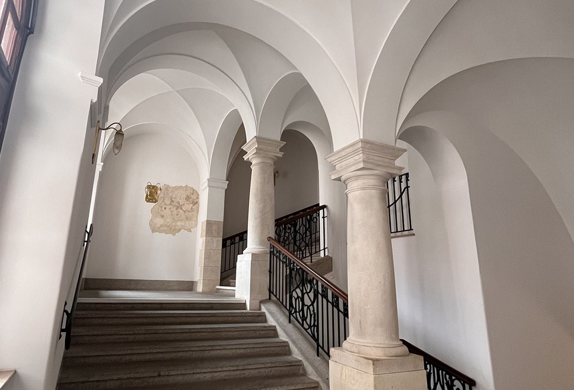 Wie aber gehen die historischen Räume mit einer modernen Verwaltung zusammen? Eine Frage, die sich für viele Kommunen stellt und Spannungsfelder schafft: Ein offenes Haus, das Politik erlebbar macht, steht im Gegensatz zum Schutz der Mitarbeitenden. Der Wunsch nach modernen, transparenten Arbeitsräumen trifft auf historische Bausubstanz. Und gleichberechtigte Teilhabe muss mit dem Denkmalschutz in Einklang gebracht werden.
