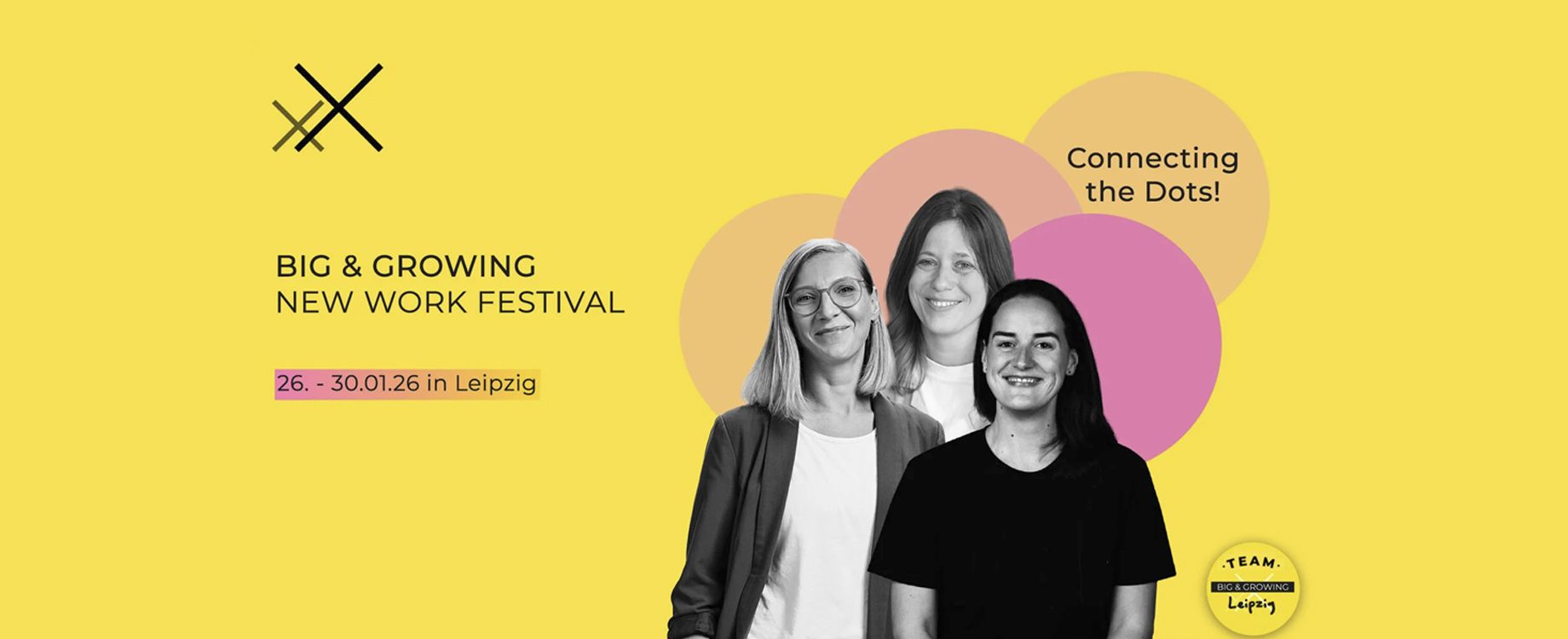 Big & Growing ist eine Community von über 5.000 Menschen, die eine bessere Arbeitswelt gestalten wollen. Fünf Tage lang treffen sich Teilnehmende aus Unternehmen, Verwaltung, Forschung und Zivilgesellschaft, um gemeinsam zu lernen, sich auszutauschen und neue Wege auszuprobieren.