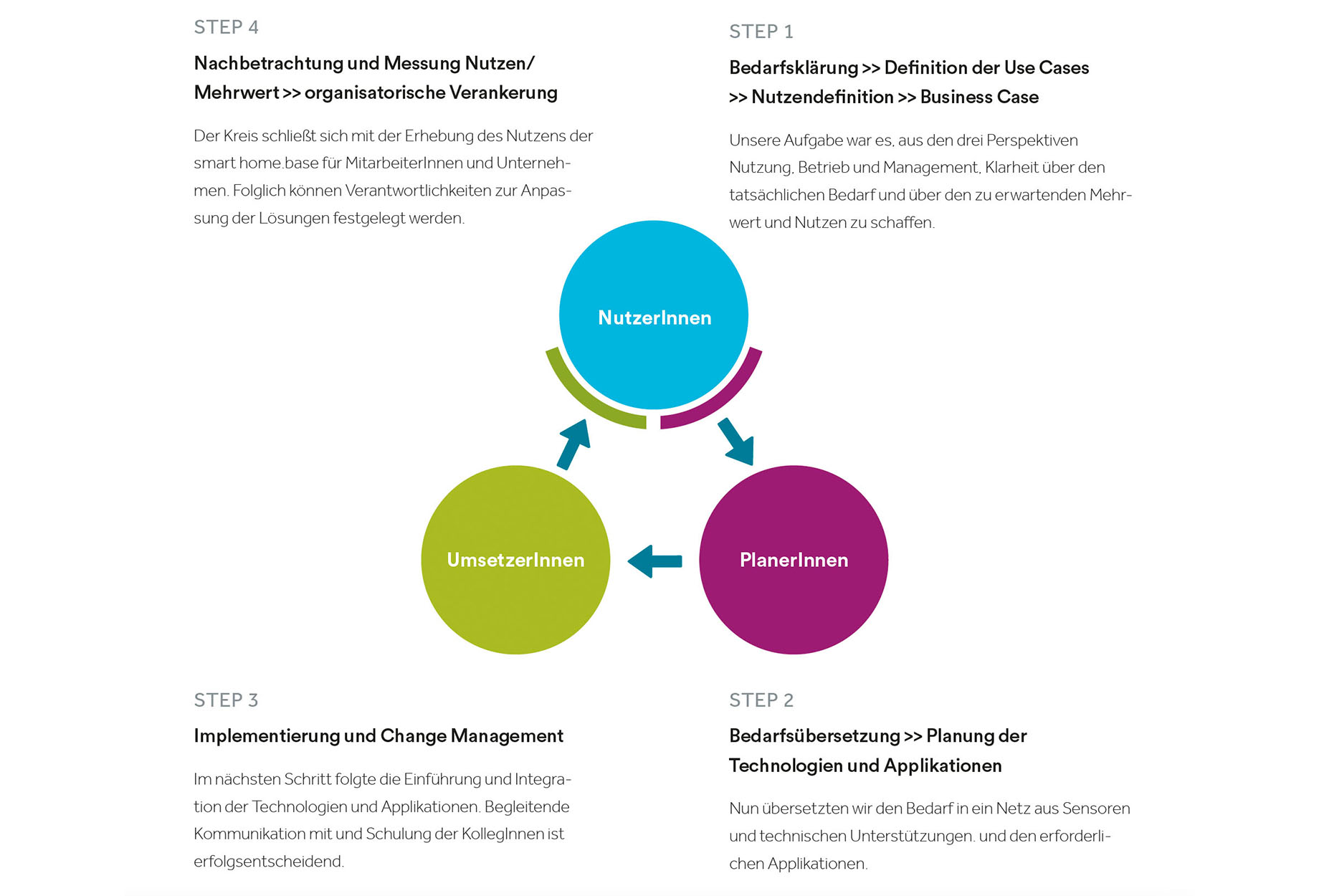 Für eine erfolgreiche Konzeptionierung eines Smart Buildings bedarf es im Vorfeld zum eigentlichen Umsetzungskonzept eine detaillierte Bedarfsplanung. Im Fall von ABB erhoben wir gemeinsam mit den Verantwortlichen des Gebäudebetriebs und des Rechenzentrums die Anforderungen zur Sicherstellung effizienter Betriebsprozesse. Darauf aufbauend legten wir anhand festgelegter UserInnen-Journeys mit den NutzerInnenvertreterInnen aller zukünftigen Funktionsbereiche bis hin zur Forschung und den Prüfständen die Anforderungen an die Funktionalitäten des Smart Buildings fest. Abschließend entschieden wir gemeinsam mit dem Management die relevanten Daten, die vom Neubau bereitgestellt werden sollen. Der gesamte Bedarf wurde strukturiert und für eine spätere Übersetzung in Lösungen anhand der Funktionalitäten eines Smart Building gegliedert.