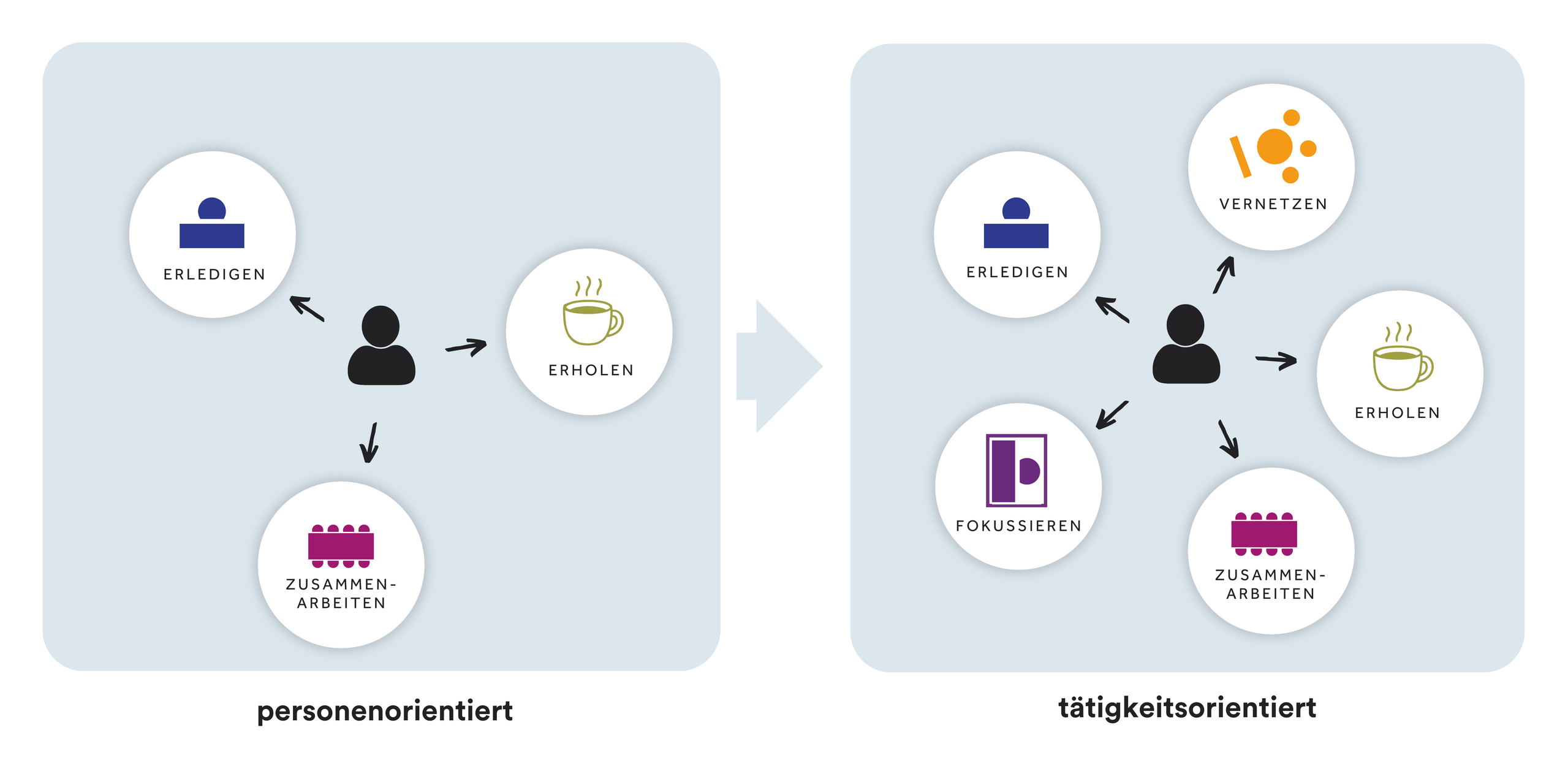 Die gemeinsame Grundlogik von Arbeits- und Lernwelten ist dabei klar:Menschen wählen Raum entsprechend ihrer Tätigkeit und ihren Bedürfnissen.