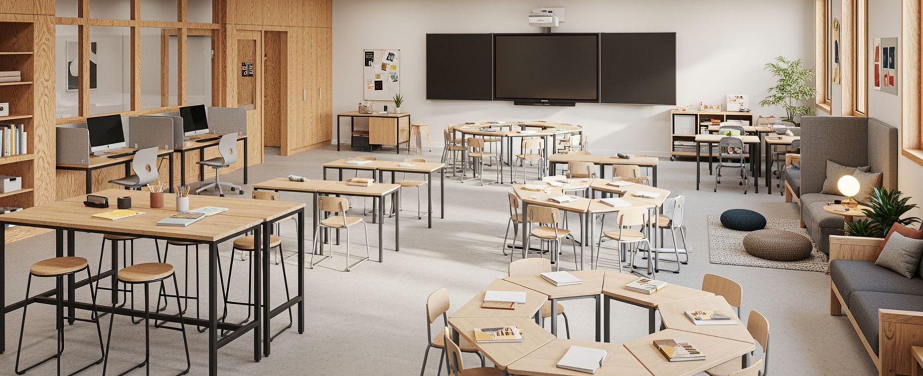Flexible, multifunktionale Zonen statt starrer Klassenräume.