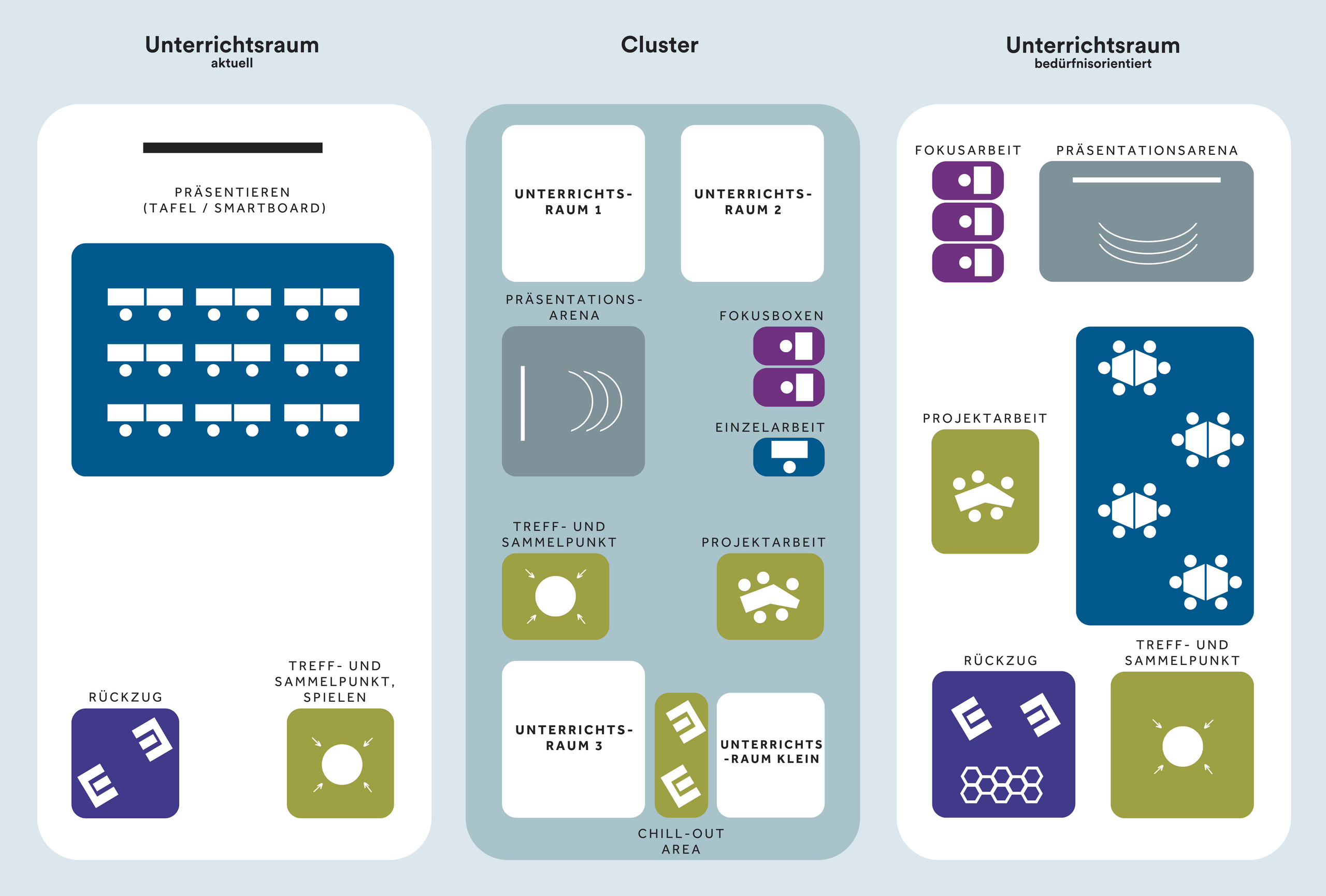 Entwicklung HIN zum bedürfnisorientierten Lernen: UNterrichtsraum heute – optimal geclustert – Unterrichtsraum zukunftsorientiert gestaltet. © M.O.O.CON